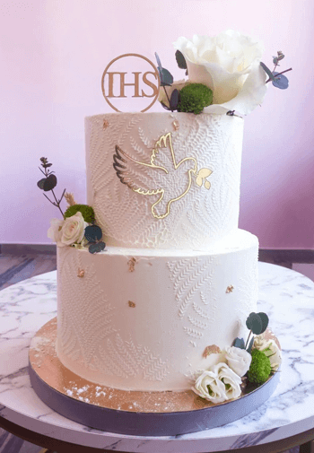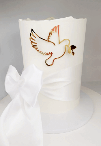 Elegancka dekoracja boczna tortu komunijnego w formie gołębicy z gałązką.