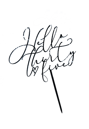 Urodzinowy cake topper z tekstem Hello thirty five wycięty z czarnej pleksi.