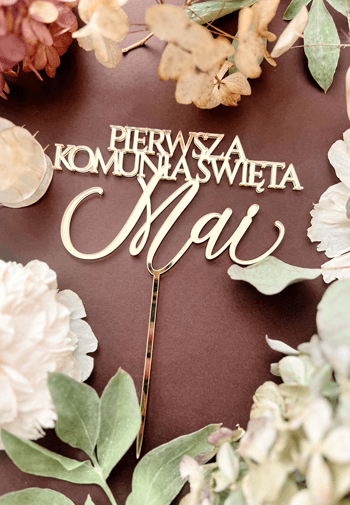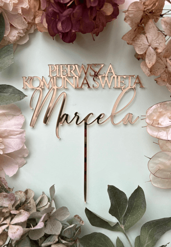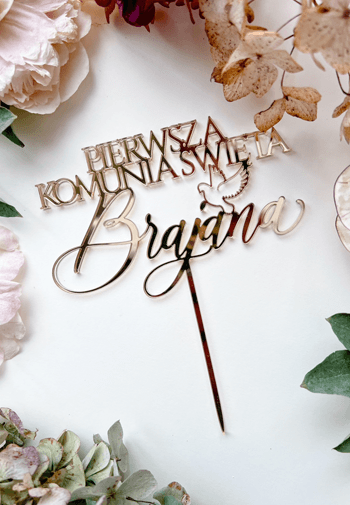 Bardzo modna w tym sezonie komunijna dekoracja z klasycznym, pełnym elegancji napisem Pierwsza Komunia Święta oraz dekoracyjnym imieniem dziecka. Dodatkowo w niektórych przypadkach dodajemy małego gołąbka, który łączy dolną linijkę imienia z górną tak by napis był stabilniejszy i połamał się w transporcie oraz podczas użytkowania (dotyczy to imion, które nie posiadają literek wysokich w końcowej części napisu).