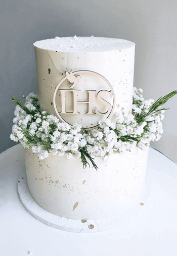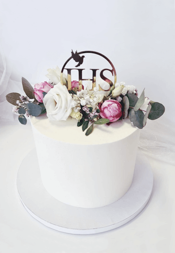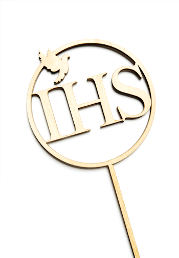 Topper komunijny IHS w obręczy z gołębicą wycięty laserowo z kartonu, sklejki brzozowej lub pleksi